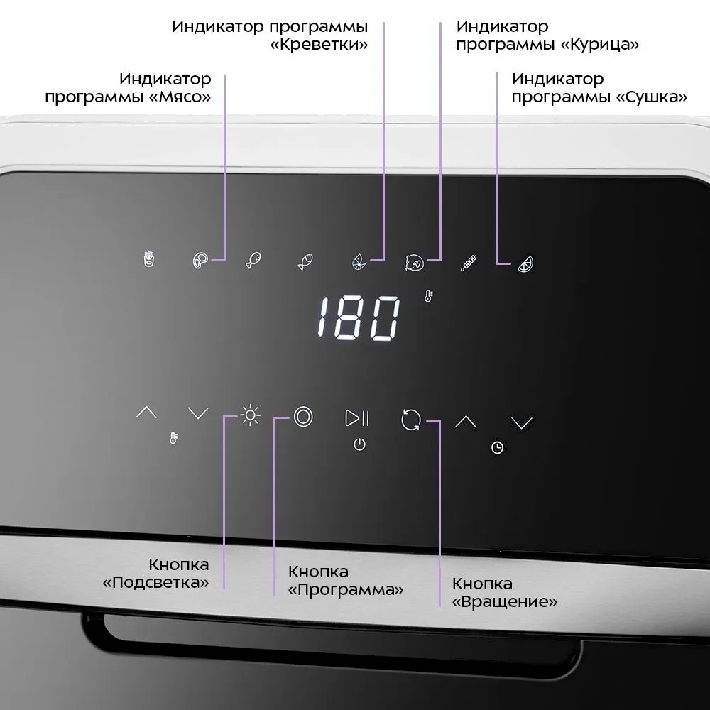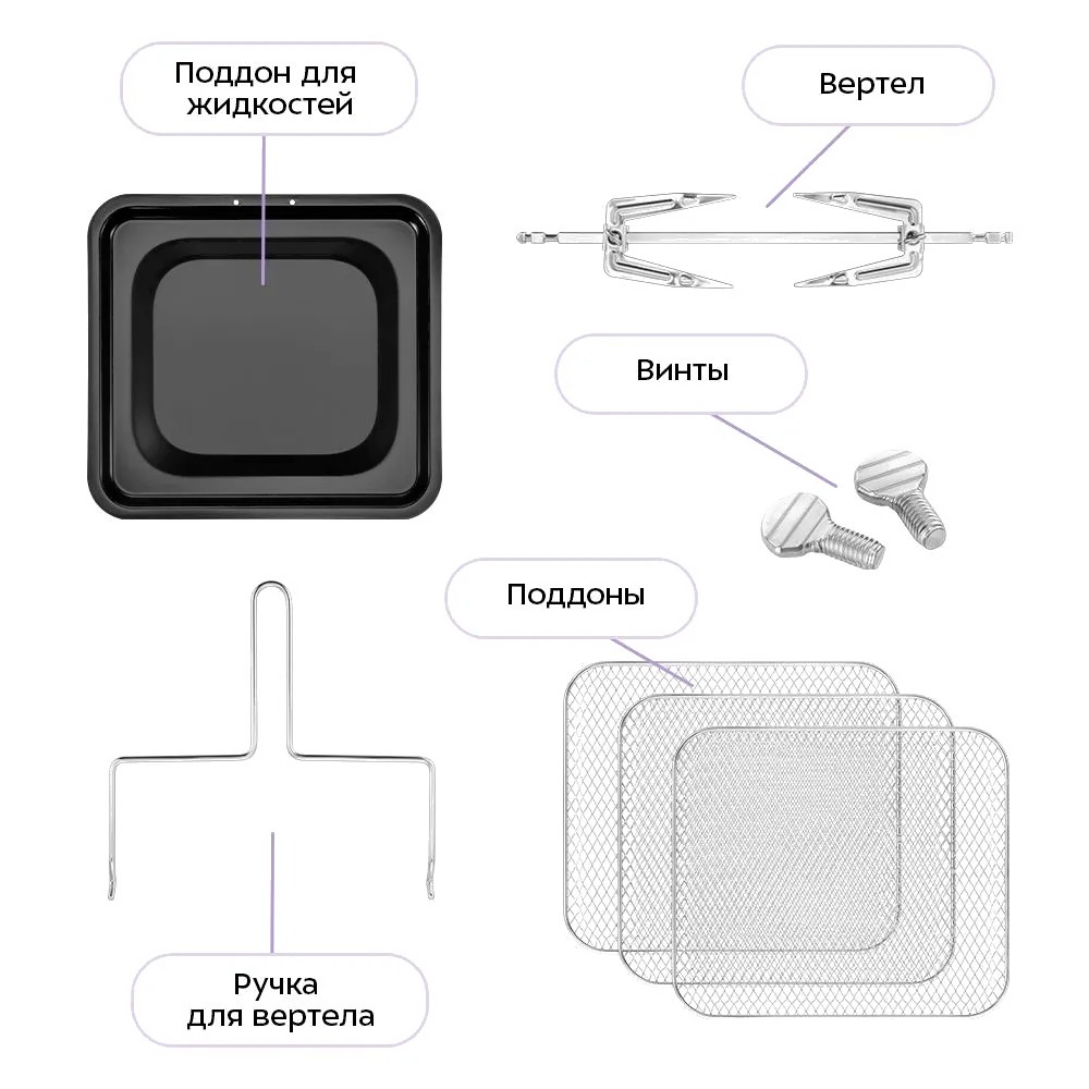• В комплекте поддон (для жидкости: 1 шт.; сетчатый: 3 шт.), вертел, съемная ручка (для вертела)