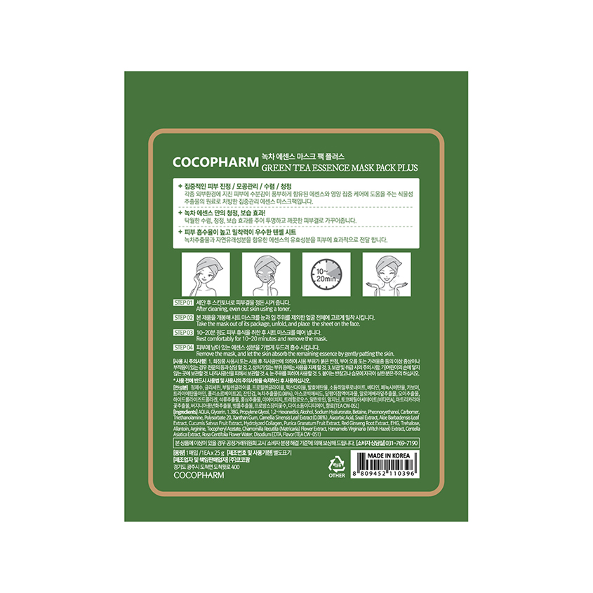 Маска для лица COCOPHARM PACK PLUS с экстрактом зеленого чая Способ применения: По применению Состав: -