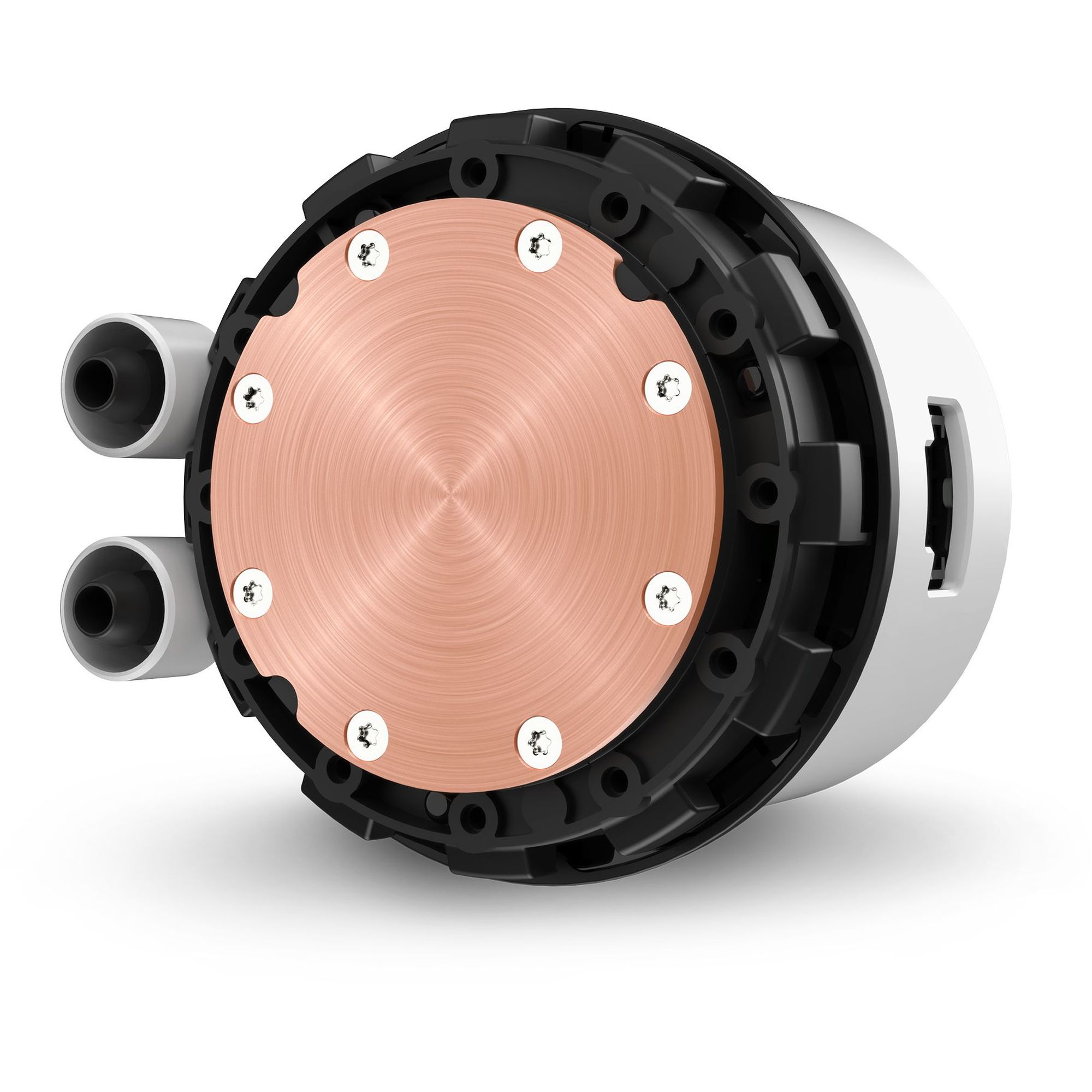 Медный водоблок имеет компактные размеры 74.7 мм в диаметре и 55.97 мм в высоту, с пластиковым корпусом в белом цвете. Встроенная помпа обеспечивает регулировку скорости от 800 до 2800 оборотов в минуту при энергопотреблении 12V DC, 0.3A.