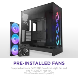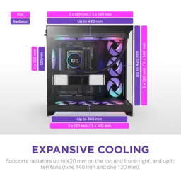 В корпусе установлено три 140 мм вентилятора с RGB-подсветкой и один 120 мм вентилятор, что обеспечивает отличную вентиляцию и позволяет создать эффектную визуализацию внутри системы. Возможность установки дополнительных вентиляторов и жидкостного охлаждения с радиаторами до 360 мм делает корпус подходящим для мощных и тихих сборок.