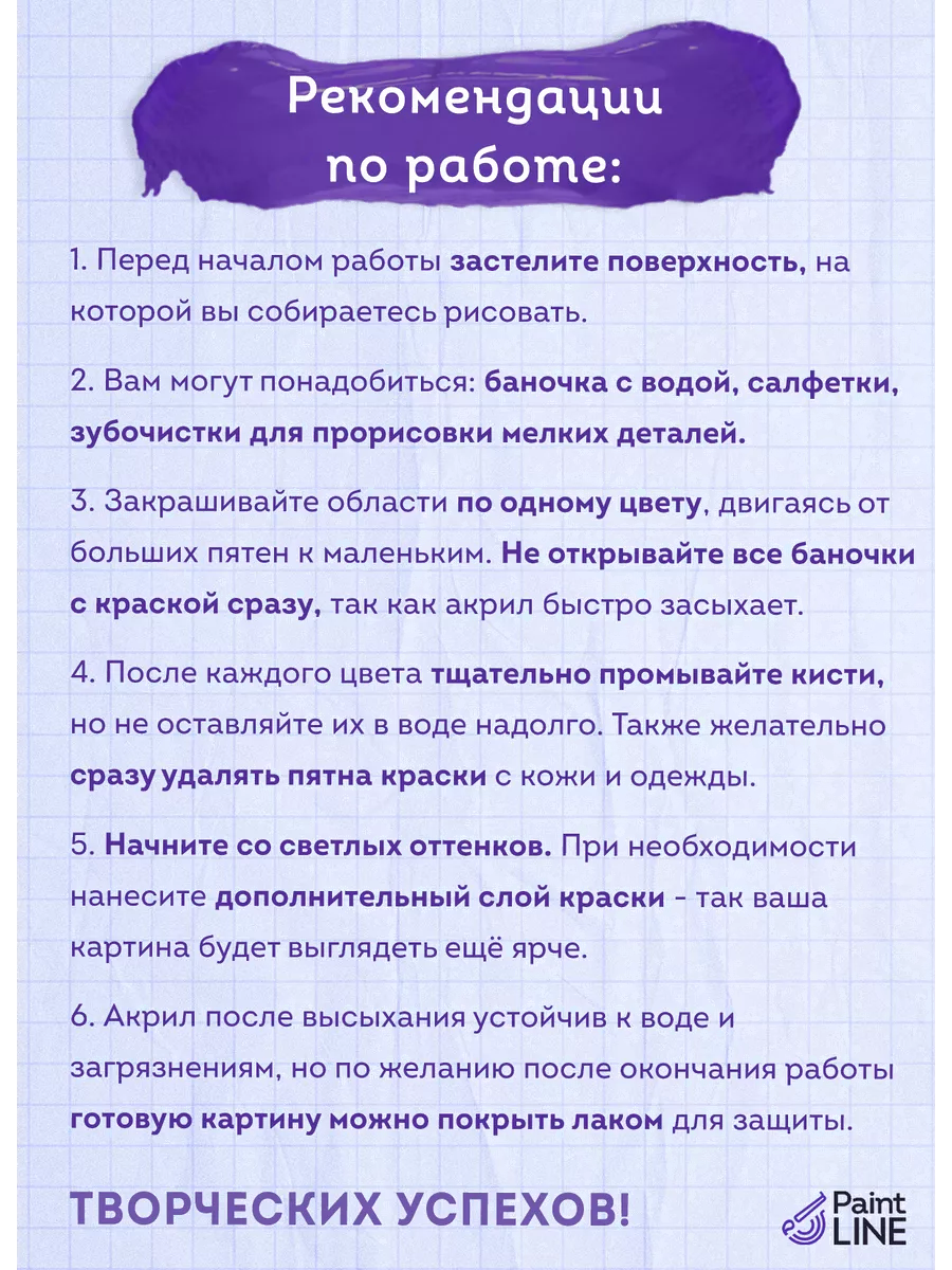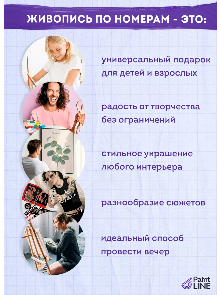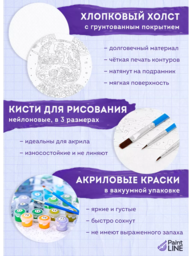 • Комплектация набора кисти (3 шт.), холст, краски, крепление