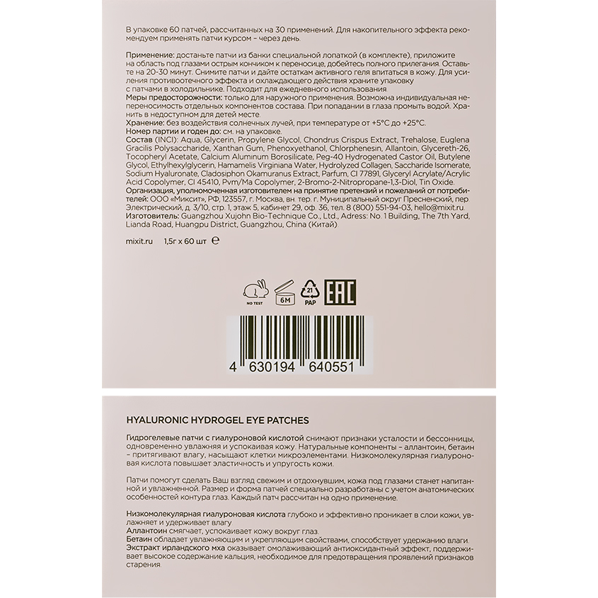 Патчи для глаз `MIXIT` гидрогелевые с гиалуроновой кислотой 60 шт