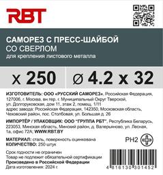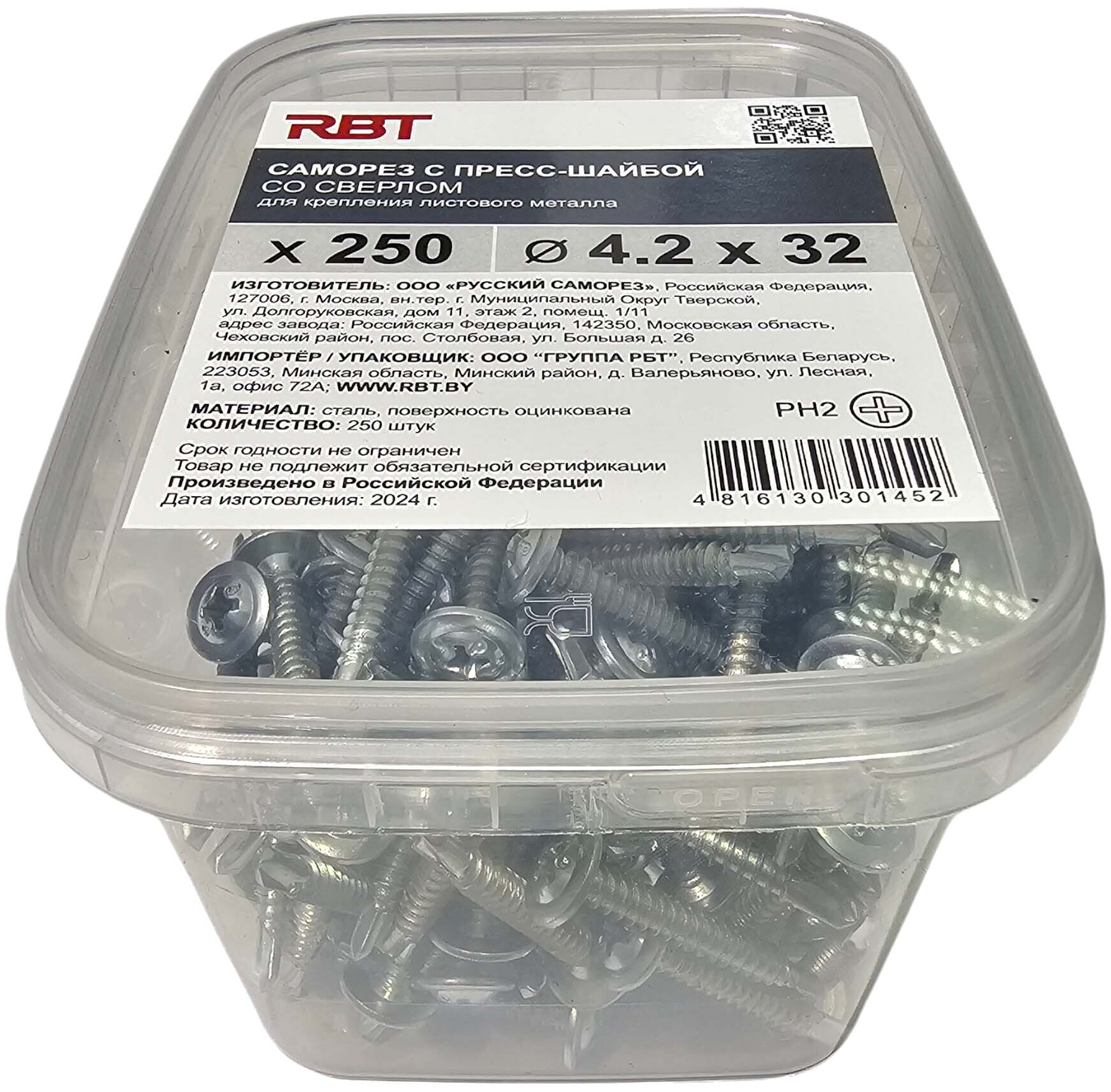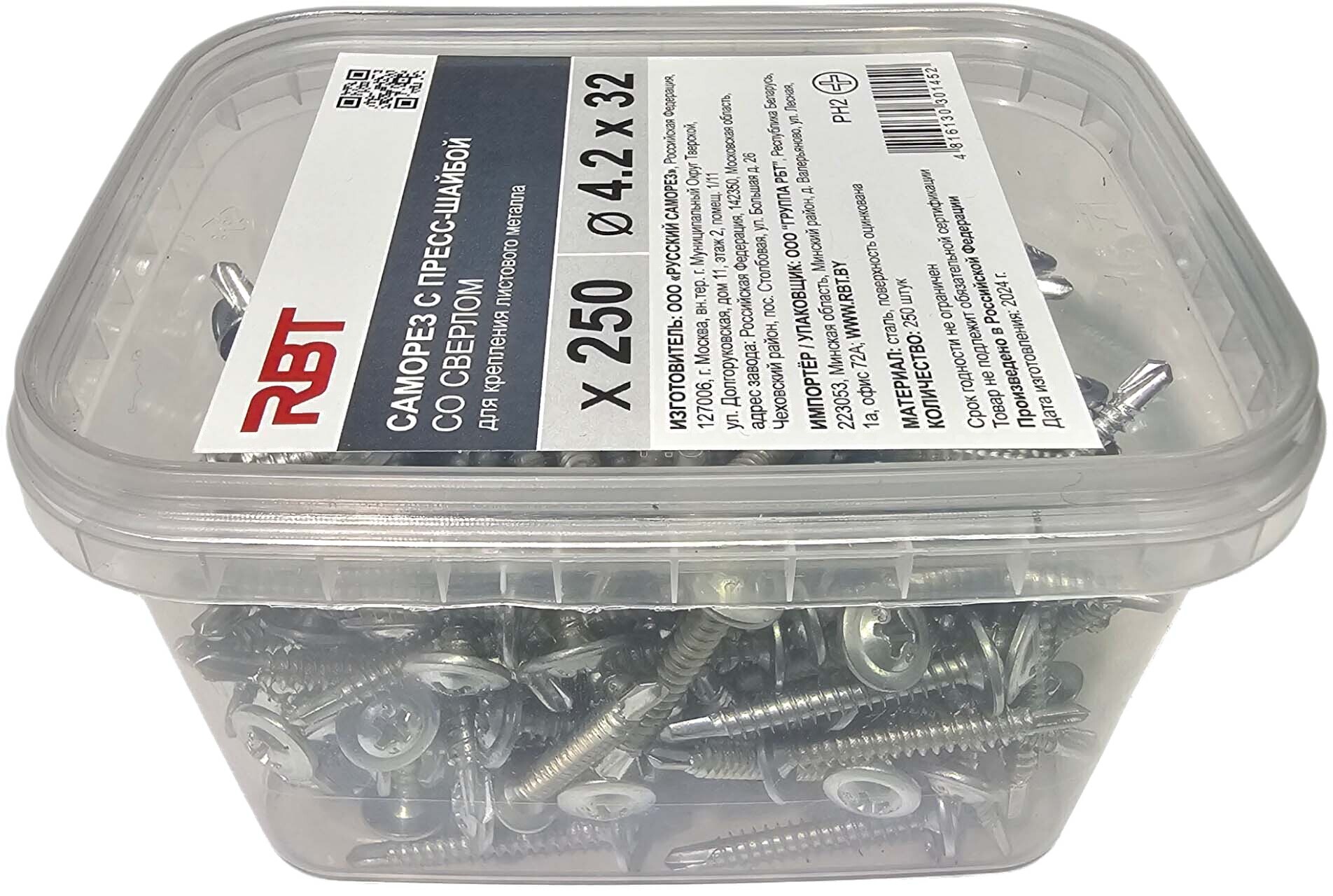 Саморез RBT СПШС/Ц 4.2х32 с прессшайбой со сверлом мелкий шаг (250шт, оцинкованный)