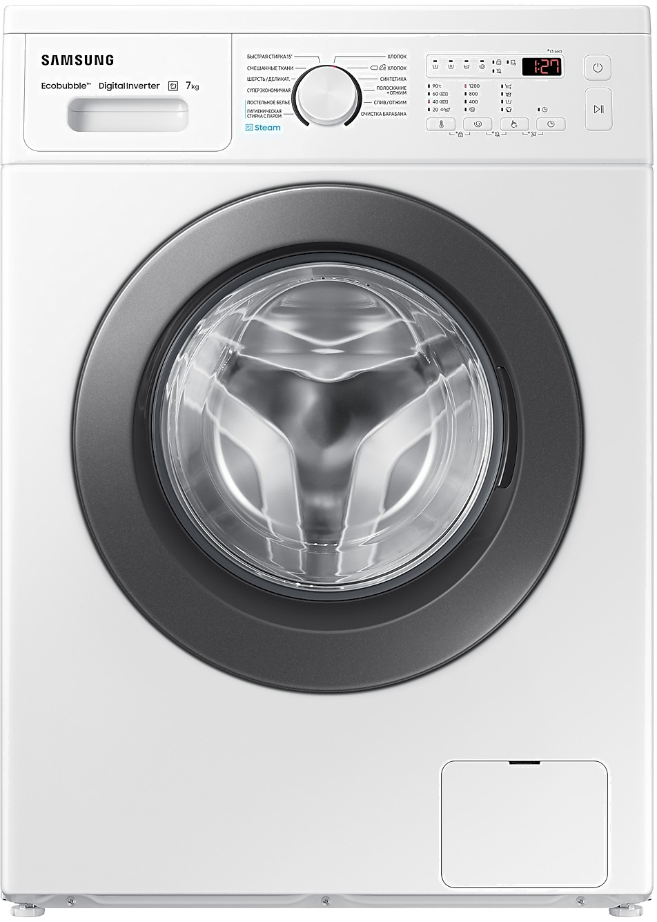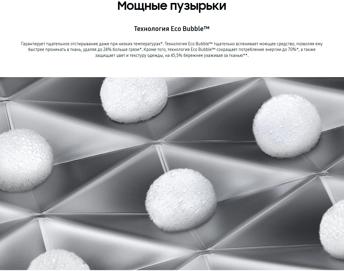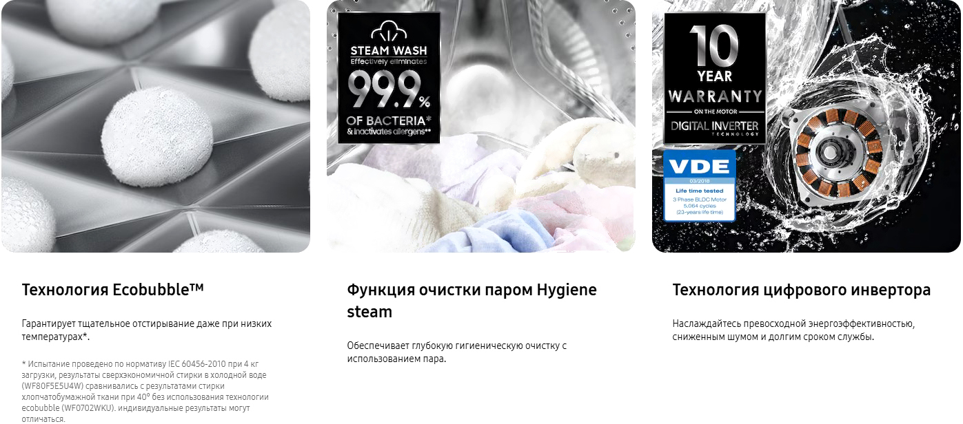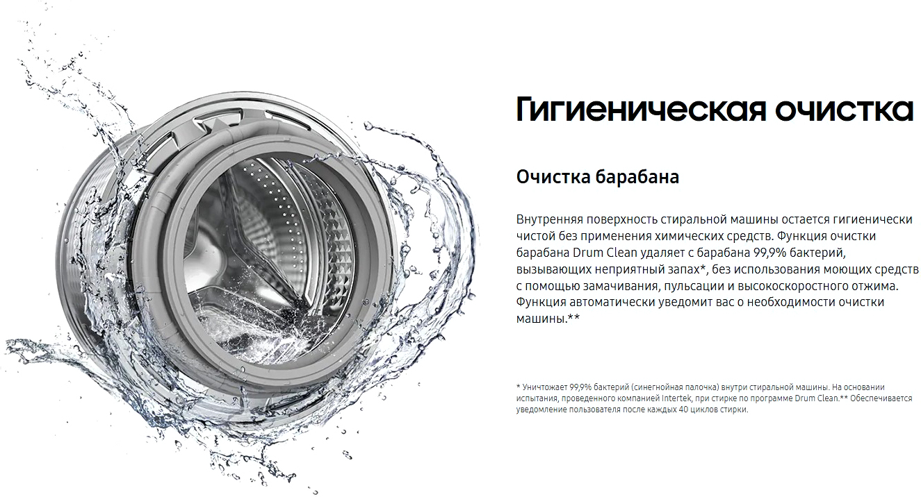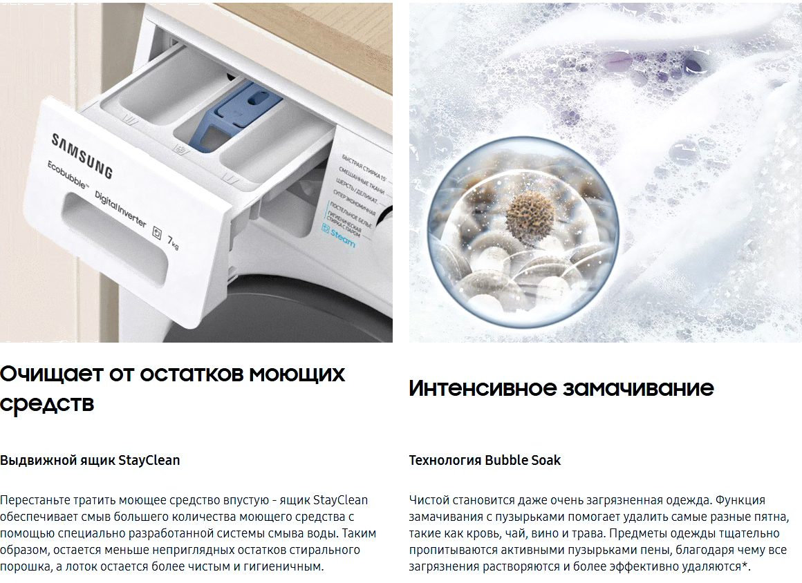 • Технологии Bubble Soak (Samsung), Drum Clean (Samsung), Eco Bubble (Samsung), Rinse+ (Samsung), Smart Check (Samsung), Stay Clean Drawer (Samsung), Volt Control (Samsung), Steam (Samsung)