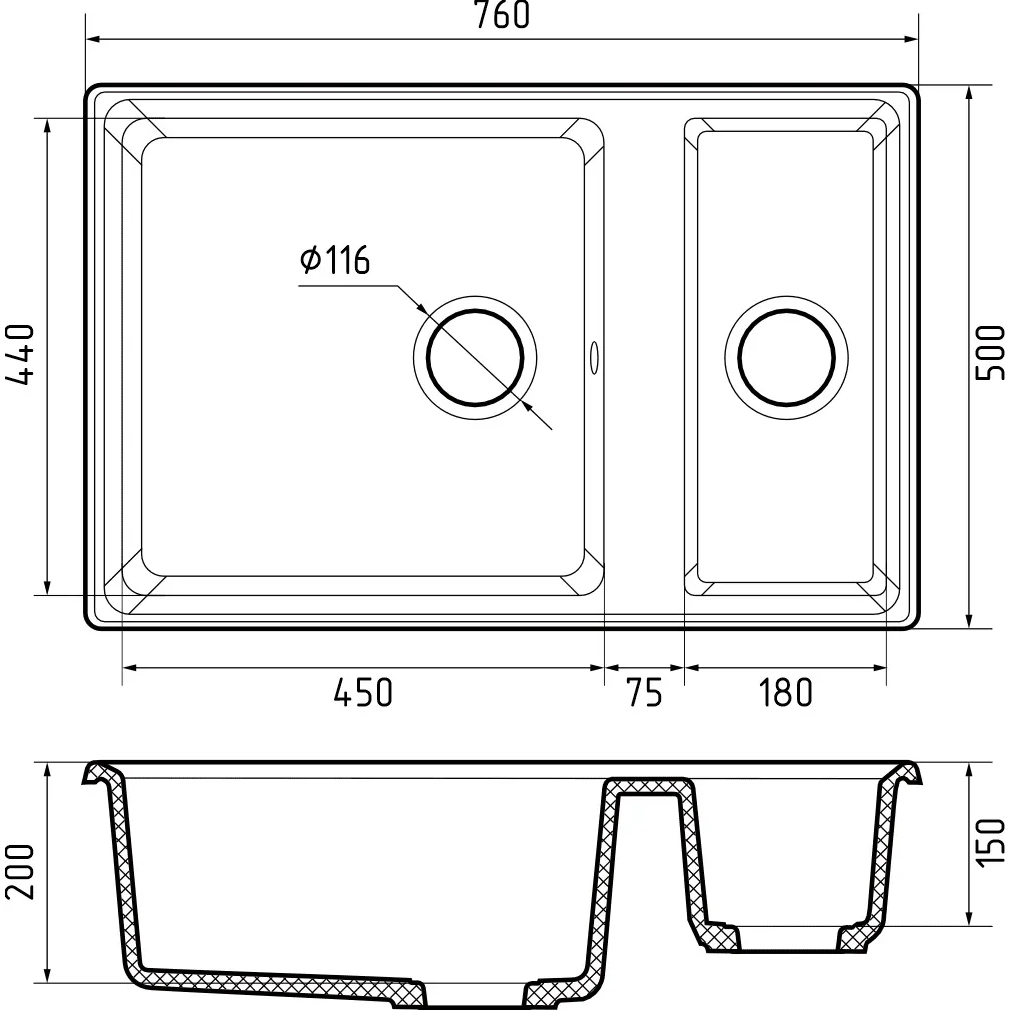 • Глубина 2-й чаши 440 мм