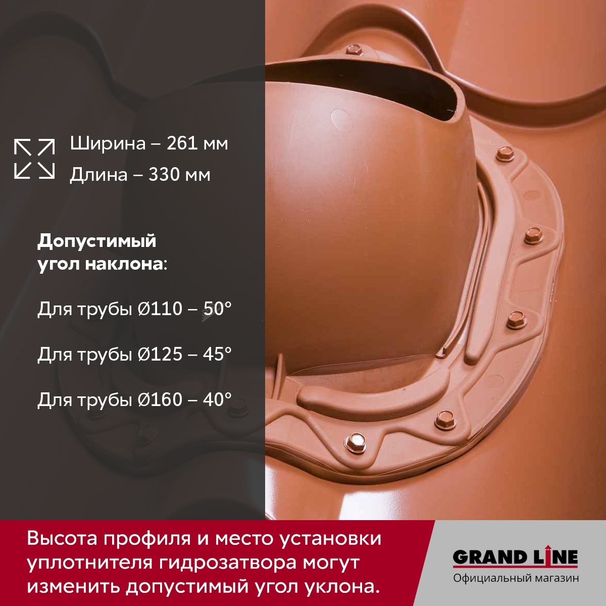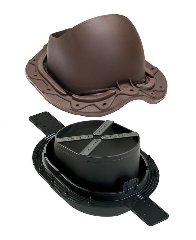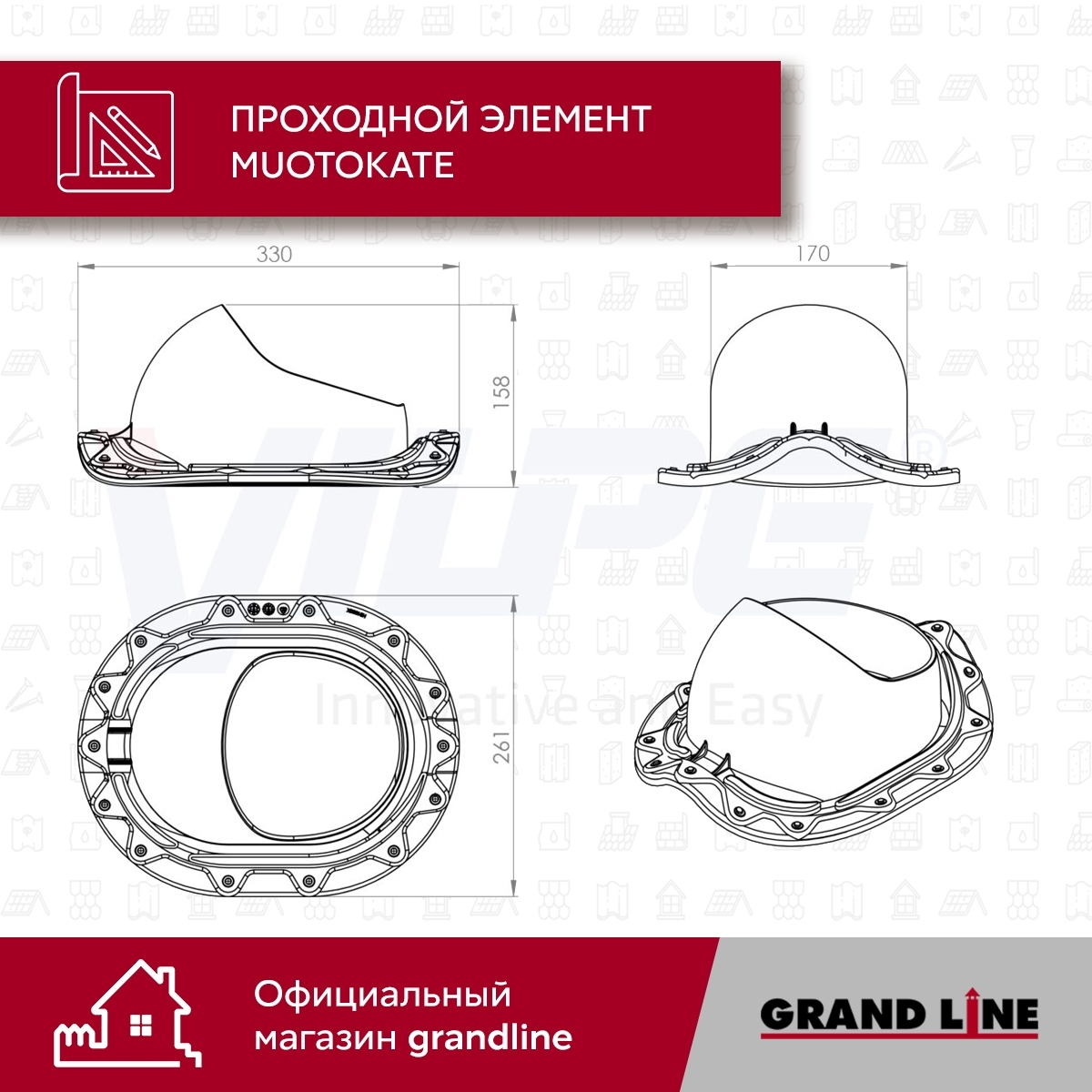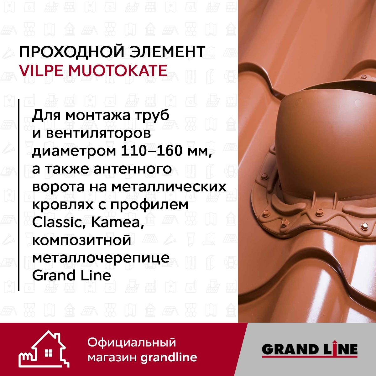 MUOTOKATE 2K проходной элемент для металлочерепицы с профилем Monterrey (ширина волны ≈ 183,3 мм, длина профиля min 350 мм, высота профиля ≈ 39 мм). В комплект входит двухкомпонентный 2K-уплотнитель гидрозатвора, гарантирующий полную герметичность прохода через гидрозащитную пленку.
