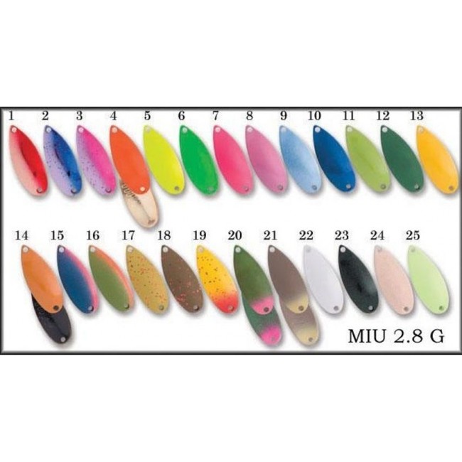 FOREST MIU 2.8g – это огромная коллекция микроколебалок с потрясающей цветовой гаммой. Данные блесны предусматривают применение различных проводок. Замеченно следующее, где бы не стояла рыба – в придонных или поверхностных слоях, эти колебалки всегда соблазняют её на поклевку. Отлично реагирует на эти блесны как прудовая, так и ручьевая форель. В широкой цветовой гамме можно найти цвета подходящие и для солнечной и для пасмурной погоды.