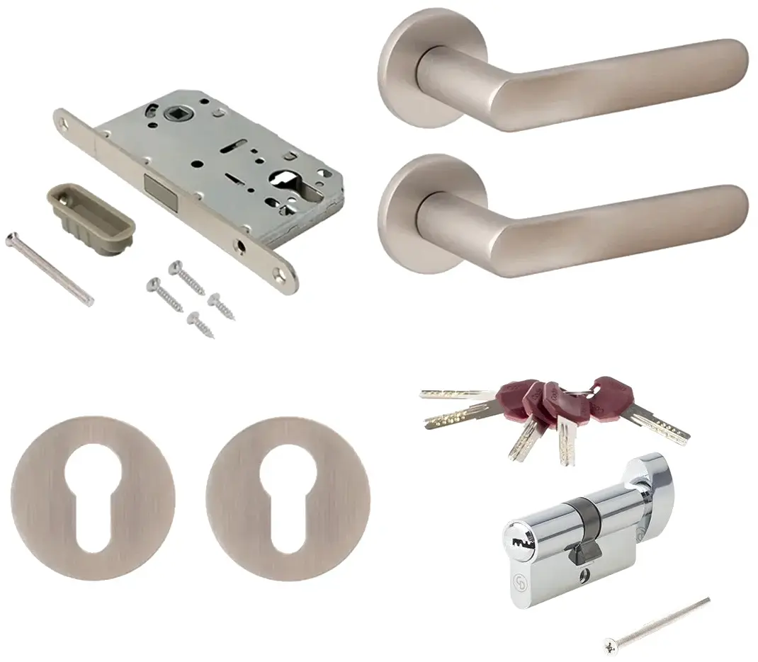 - Состав комплекта ручка дверная (2 шт.), цилиндровый механизм замка (1 шт.), замок врезной (1 шт.), накладка на цилиндр (2 шт.)