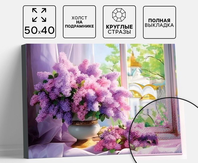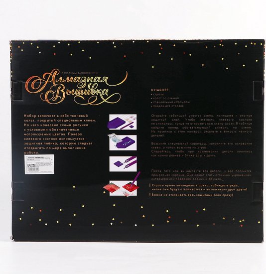 • Комплектация основа для картины, набор страз, лоток для страз, стилус, клеевая подушка, подрамник, подвесы для подрамника