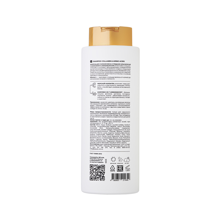 Шампунь для усиления блеска и придания силы волосам с коллагеном и аминокислотами интенсивно очищает, уплотняет и усиливает зеркальный блеск. Разработанная экспертами биодоступная формула создана специально для быстрого возвращения волосам их жизненной силы. Синергия коллагена и комплекса аминокислот работает на восстановление целостности кутикулы и усиление здорового сияния волос. Результат здоровые и сильные волосы от корней до кончиков без сечения и ломкости. Морской коллаген уплотняет, повышает упругость и эластичность, уменьшает статику волос, способствует усилению естественного блеска. 7 аминокислот: бетаин, глицин, аргинин, цистеин, гистидин, глютамин, лизин - комплекс увеличивает жизнеспособность клеток в структуре волоса, возвращает силу, предотвращает спутывание и ломкость.
