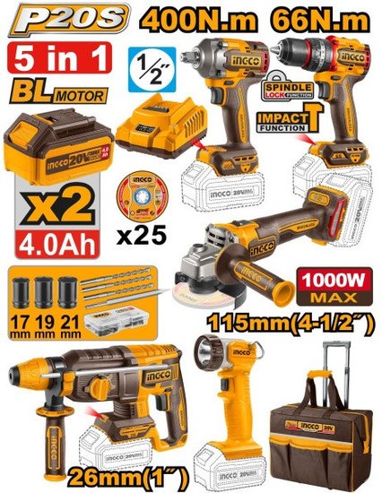 - Комплектация 1. Аккумуляторный гайковерт BL 20В 400Hm 1/2 SUPER INGCO CIWLI2040 INDUSTRIAL 2. Аккумуляторный перфоратор BL 20В 2,5Дж SUPER INGCO CRHLI20268 INDUSTRIAL 3. Аккумуляторная УШМ 20В, BL 115мм SUPER INGCO CAGLI27153 INDUSTRIAL 4. Аккумуляторный ударный шуруповерт 20B BL 66Hm без АКБ и ЗУ SUPER INGCO CIDLI206681 INDUSTRIAL 5. Аккумуляторный фонарь 20В, 5Вт, 270Лм без АКБ и ЗУ INGCO CWLI2038 INDUSTRIAL Количество аккумуляторов в комплекте: есть 4.0Ач - 2шт. Зарядное устройство FCLI20411 4.0А - 1шт. Упаковка: Цветная коробка + сумка на колесах.