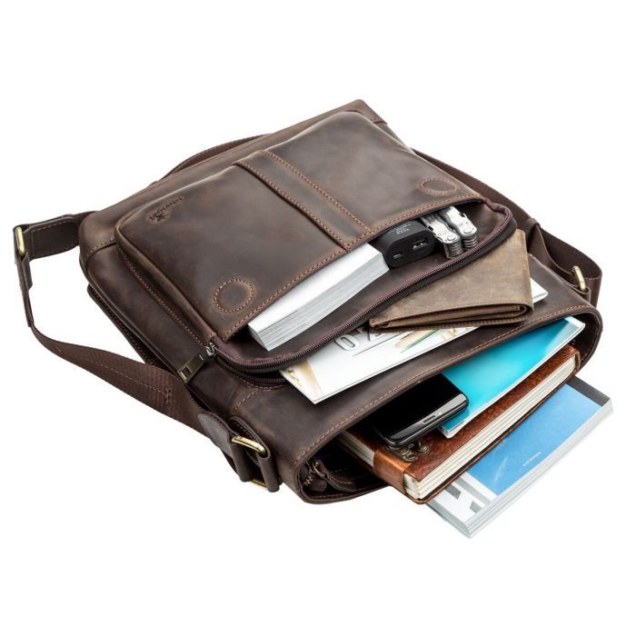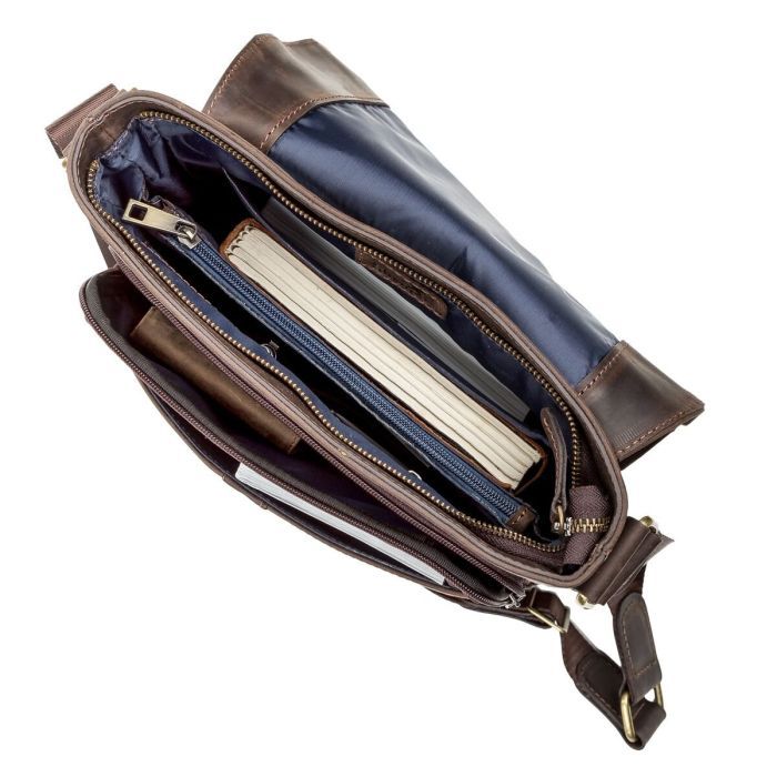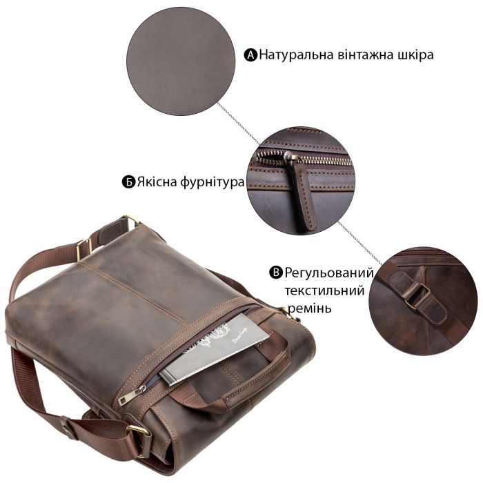 Особливостіплечовий регульований ремінець , на тильній стороні кишеня на блискавці , вміщує формат А4 , ручка для носіння в руці , дві вмісткі кишені під клапаном