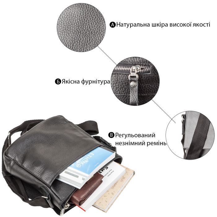 Особливостіна тильній стороні кишеня на блискавці , текстильний регульований незнімний ремінець на праве або ліве плече , підкладка з надміцного текстильного матеріалу , вмістка кишеня під клапаном