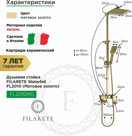 ❗️Текст описания составлен при помощи искусственного интеллекта.✅ Душевая система FILARETE Waterfall FL2010 — это идеальное решение для создания стильного и функционального пространства в вашей ванной комнате. Изготовленная из высококачественной латуни, она гарантирует долговечность и надежность на протяжении многих лет. С гарантией 7 лет вы можете быть уверены в ее качестве и производительности.✅ Установка данной душевой системы осуществляется на стену, что позволяет сэкономить пространство и создать аккуратный вид. Поворотный излив и три режима струи обеспечивают максимальный комфорт во время принятия душа, а длина шланга в 150 см позволяет легко маневрировать.✅ Высота штанги в 150 см и размер верхнего душа 300 мм делают использование системы удобным для всех членов семьи. Керамический картридж запорного клапана обеспечивает плавное управление и надежную работу смесителя, что делает процесс принятия душа еще более приятным.⚠️ Не упустите возможность преобразить вашу ванную комнату с помощью душевой системы FILARETE Waterfall FL2010. Это не просто сантехника, а стильный элемент интерьера, который добавит изысканности и комфорта в ваше ежедневное использование.✅ Выбирая душевую систему, вы получаете не только функциональность, но и эстетическое удовольствие. FILARETE Waterfall FL2010 станет настоящим украшением вашей ванной, а также обеспечит вам незабываемые моменты расслабления и уединения.❗️Текст описания составлен при помощи искусственного интеллекта.✅ Душевая система FILARETE Waterfall FL2010 — это идеальное решение для создания стильного и функционального пространства в вашей ванной комнате. Изготовленная из высококачественной латуни, она гарантирует долговечность и надежность на протяжении многих лет. С гарантией 7 лет вы можете быть уверены в ее качестве и производительности.✅ Установка данной душевой системы осуществляется на стену, что позволяет сэкономить пространство и создать аккуратный вид. Поворотный излив и три режима струи обеспечивают максимальный комфорт во время принятия душа, а длина шланга в 150 см позволяет легко маневрировать.✅ Высота штанги в 150 см и размер верхнего душа 300 мм делают использование системы удобным для всех членов семьи. Керамический картридж запорного клапана обеспечивает плавное управление и надежную работу смесителя, что делает процесс принятия душа еще более приятным.⚠️ Не упустите возможность преобразить вашу ванную комнату с помощью душевой системы FILARETE Waterfall FL2010. Это не просто сантехника, а стильный элемент интерьера, который добавит изысканности и комфорта в ваше ежедневное использование.✅ Выбирая душевую систему, вы получаете не только функциональность, но и эстетическое удовольствие. FILARETE Waterfall FL2010 станет настоящим украшением вашей ванной, а также обеспечит вам незабываемые моменты расслабления и уединения.