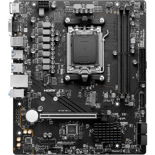 Материнская плата MSI PRO B650M-E – устройство форм-фактора Micro-ATX с размерами 244x211 мм подходит для сборки мощного универсального компьютера для дома или офиса. Плата работает под управлением чипсета AMD B650 и поддерживает процессоры AMD Ryzen 7000, 8000 и 9000. Подсистема памяти с поддержкой технологий разгона AMD EXPO обеспечивает стабильность работы модулей DDR5. Максимальный объем ОЗУ равен 128 ГБ.