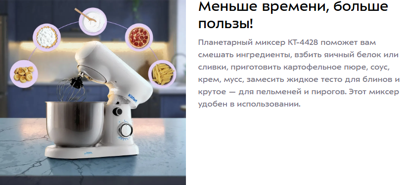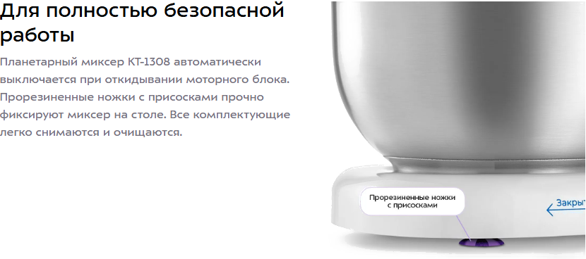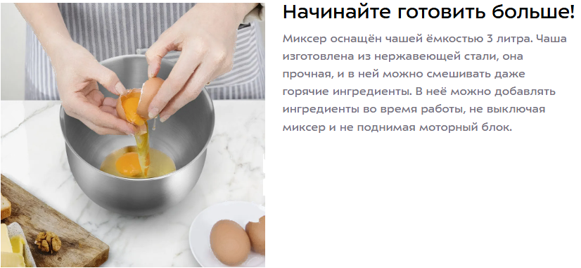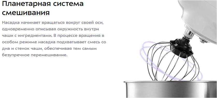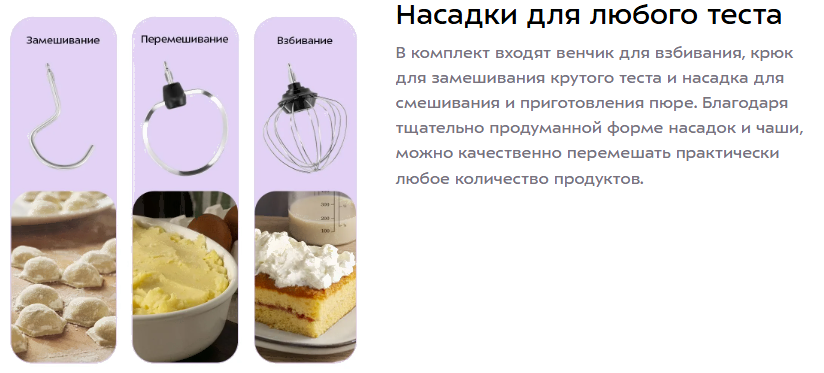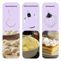 • В комплекте крюк для теста, насадка для взбивания, насадка для смешивания