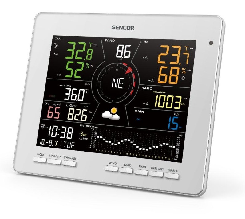 • Измерения прогноз погодывнутренняя температуравнешняя температуравнутренняя влажность / 1 ~ 99% /внешняя влажность / 1 ~ 99% /атмосферное давлениеуровень осадковточка росыУФ излучение