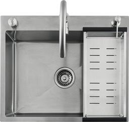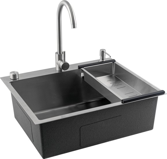 КомплектацияПолуавтоматический сифон Pop up, коландер(Сатин), гофра, дозатор для моющего средства(Сатин), мойка(Сатин), Смеситель