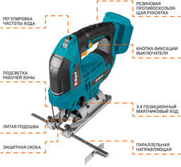 • Дополнительные функции регулировка угла наклона (45°), система быстрой замены пилок, подсветка, блокировка кнопки включения