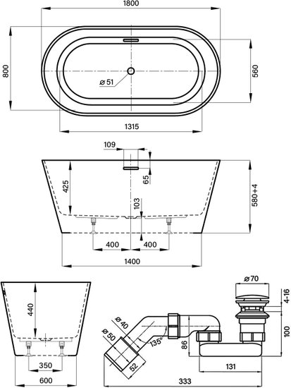 Shell 180x80 28170402R (отдельностоящая ванна белый глянец, экран, ножки, сифон-автомат глянцевый белый)