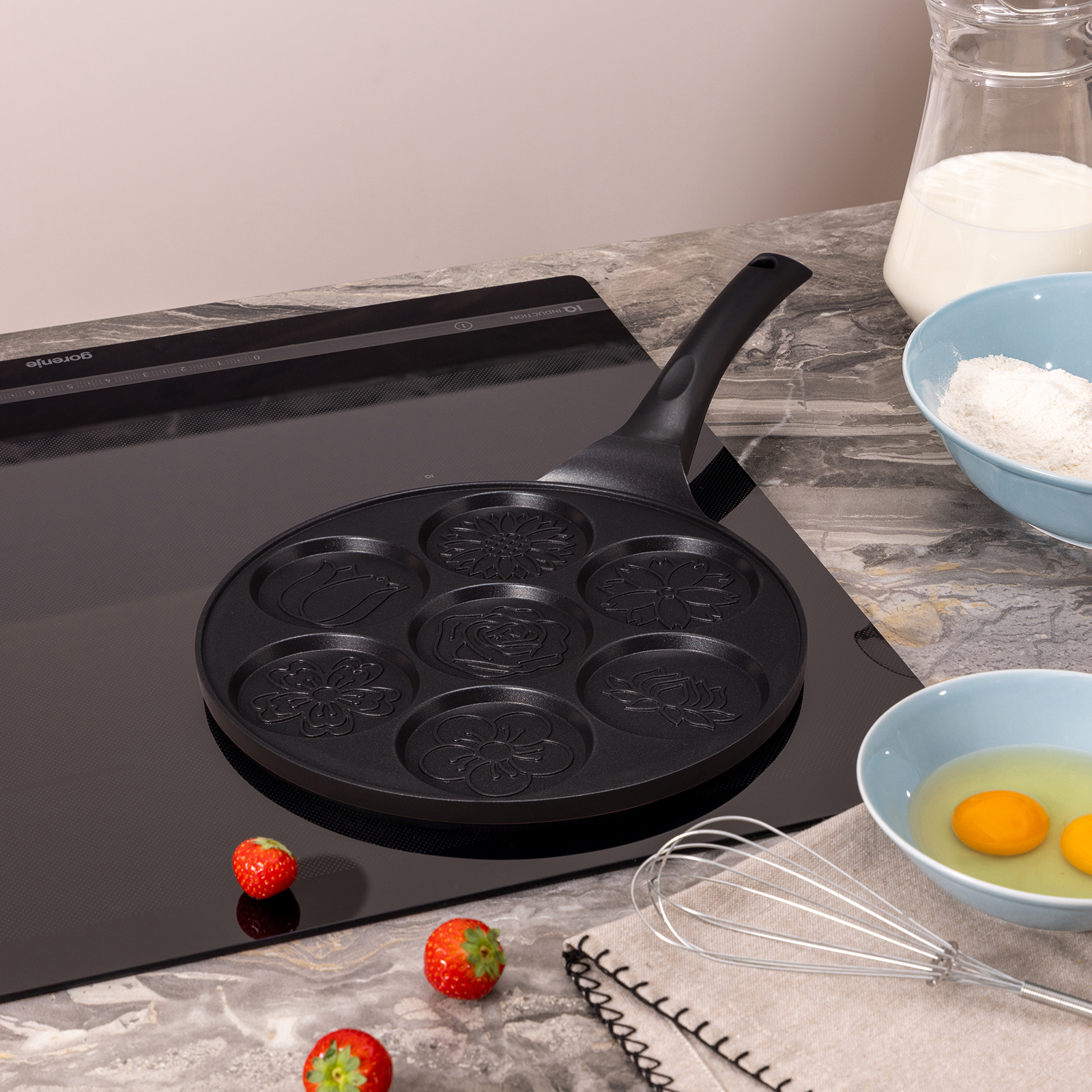 Сковороды AGNESS серии "FLOWER STORY" выполнены из литого алюминия. Такая посуда отличается высокой теплопроводностью и устойчивостью к деформациям. Необычный дизайн сковороды позволит приготовить интересные и веселые оладушки и омлеты.