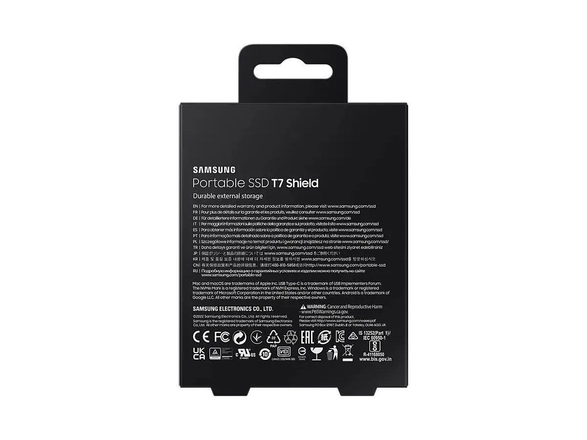 Твердотельный диск Samsung 1Tb T7 Shield с типом памяти SSD, предназначен для использования в домашних системах или ноутбуках. Диск выполнен в формате 1.8 с интерфейсом подключения USB 3.2 Gen2 Type-C. Соответствие требованиям директиве RoHS - RoHS2. Сертификация - CE, BSMI, KC, VCCI, C-tick, FCC, IC, UL, TUV, CB, EAC, UKCA, BIS. Безопасность: Samsung Portable SSD Software 1.0, Samsung Magican Software