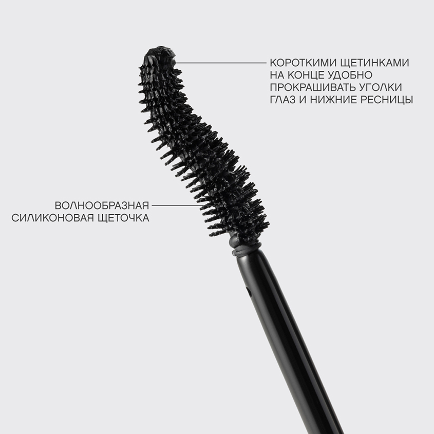 Необычно волнообразная силиконовая щеточка позволяет получить суперобъемные ресницы, а также приподнимет и подкрутит их, создав эффект керлера. Ее короткими щетинками на конце легко можно прокрасить ресницы во внутреннем уголке глаза или проработать нижние реснички. Насыщенный черный пигмент придает взгляду глубину и выразительность, делая его неотразимым. Тушь стойко держится в течение дня, не осыпается и не отпечатывается на веке.