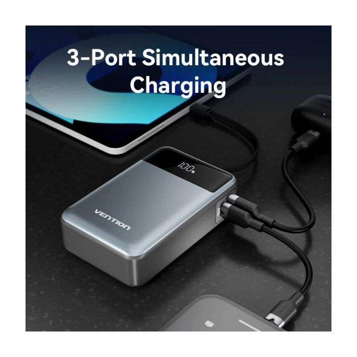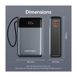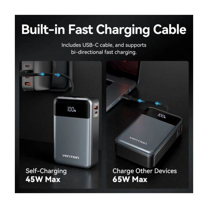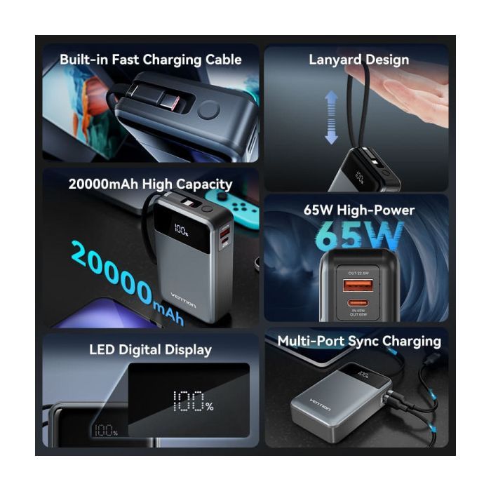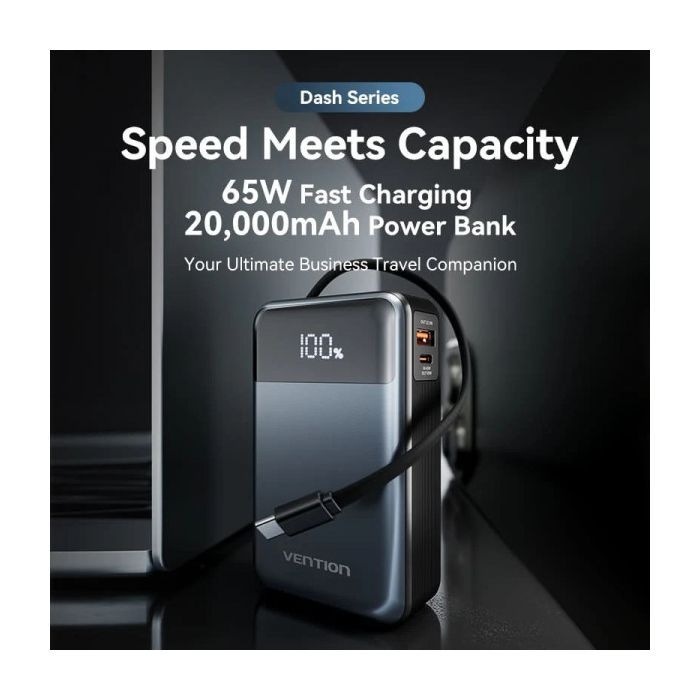 Батарея універсальна Vention 20000mAh 65W 3A PD, QC/3.0, USB-A, Type-C OUT, with Built-in USB-C Cable, LED Display (FHYB0)
