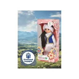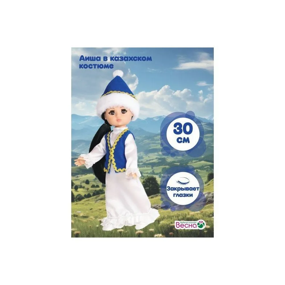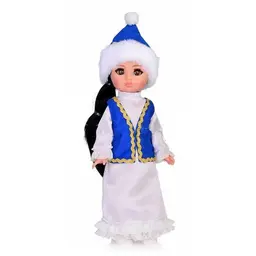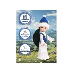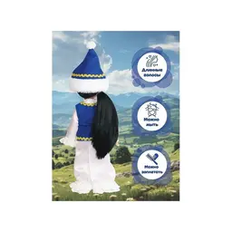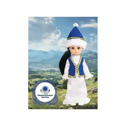 Аиша в казахском костюме станет лучшей подружкой для вашего ребёнка. В игровой форме ребёнок познакомится с обычаями и традициями Казахстана. Уникальный молд, выполненный с учётом национальных особенностей, подчёркивает индивидуальность куклы Аиша. Национальный казахский костюм максимально приближен к оригинальному наряду страны. В одежде присутствуют стилизованные элементы народного костюма. В комплект одежды входит: белое традиционное платье, жилетка, головной убор и туфли. Рост куклы составляет 30 см. Чёрные густые волосы длинной 180 мм прошиты по всей голове. Глаза вставные, закрывающиеся. Роспись лица выполнена вручную, присутствуют элементы нанесения аэрографом. Ручки и голова выполнена из ПВХ-пластизоля, а туловище и ножки из пластмассы. Кукла удобна в использовании, ручки и ножки можно поворачивать с легкостью. Продуманная конструкция куклы позволяет её сажать, ставить на ножки и переодевать. Аиша в казахском костюме подходит для разнообразных сюжетных игр и познакомит ребёнка с национальными традициями Казахстана.