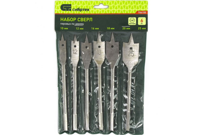 Набор сверл перовых по дереву 10-12-16-18-20-25мм уп-6шт 6-гранный хвостовик Сибртех 704155 *1/50