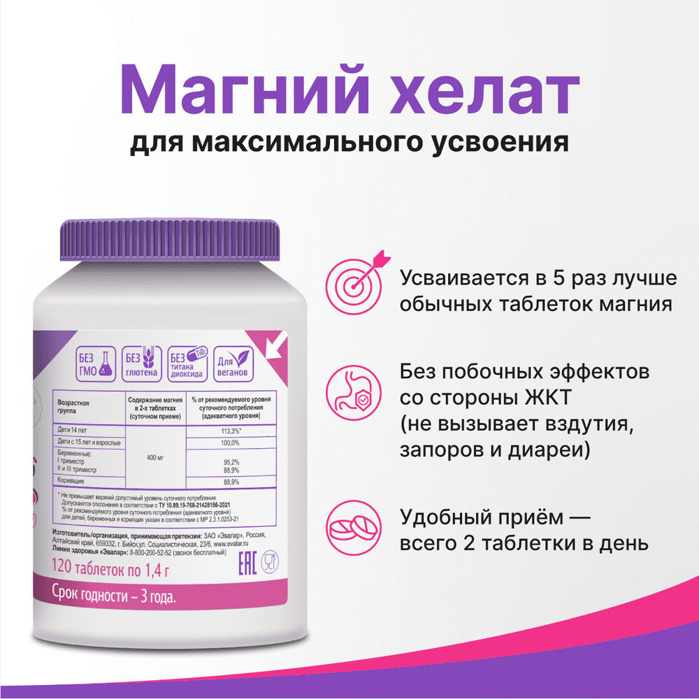Магний хелат Эвалар – это биологически активная добавка в форме таблеток, содержащая магний в высоко усвояемой хелатной форме (в виде соединения с аминокислотами), без нагрузки на ЖКТ. Препарат способствует восполнению дефицита магния в организме, поддерживает работу нервной системы, сердца, мышц и обменные процессы. <br>