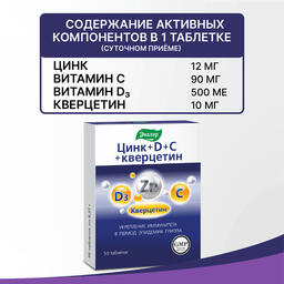 Эвалар Цинк+D+C+Кверцетин - уникальный комплекс для усиления иммунного ответа. Специально разработанная формула сочетает цинк, витамины D3 и C с кверцетином для максимальной поддержки защитных сил организма и борьбы с вирусами. <br>
