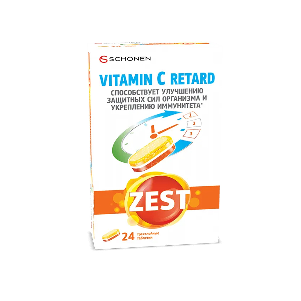 Зест Витамин С Ретард – инновационные трехслойные таблетки с пролонгированным действием, обеспечивающие постепенное 24-часовое высвобождение витамина С. <br>