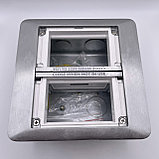 Компактный металлический напольный лючок, достаточно места для подключения двух силовых розеток и, при необходимости, двух телекоммуникационных модулей.