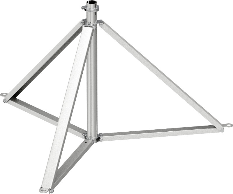 Складной треножный штатив для безболтовой установки молниеприемных мачт, изолированных молниеприемных мачт диаметром 40 мм, а также для крепления провода OBO isCon®; максимальный наклон кровли 5 градусов; бетонные основания и резьбовые стержни необходимо заказать отдельно.