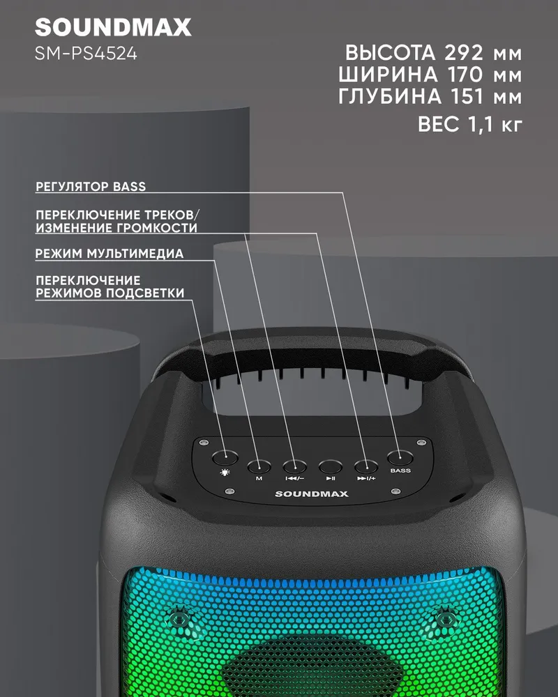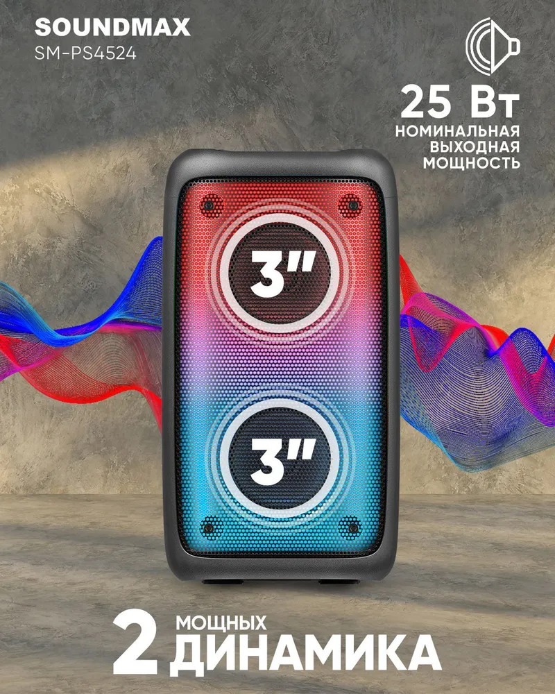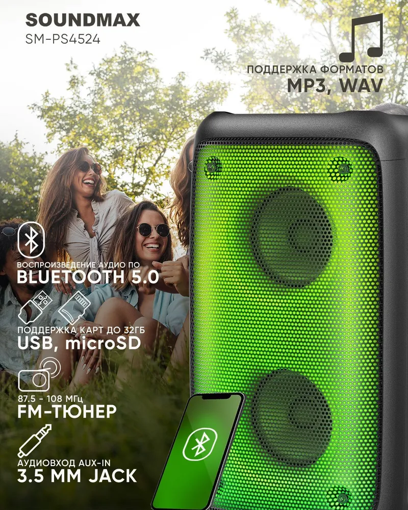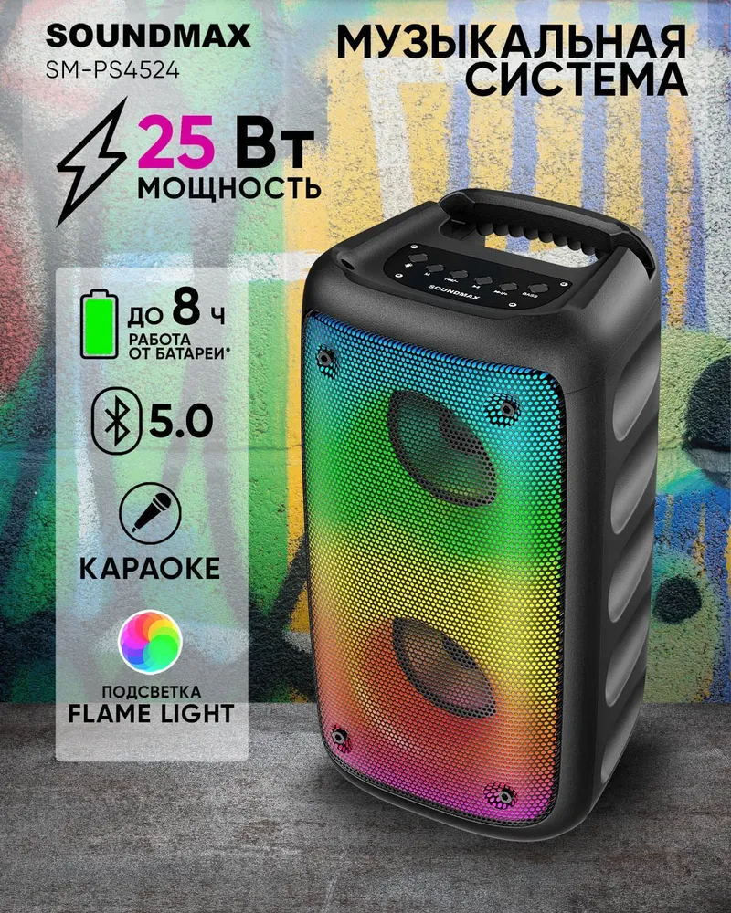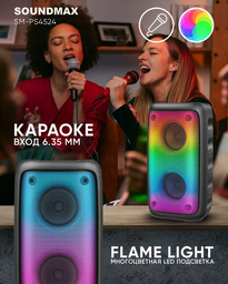 • Функции и особенности караоке,FM-радио,режим усиления басов,подсветка корпуса,беспроводная синхронизация