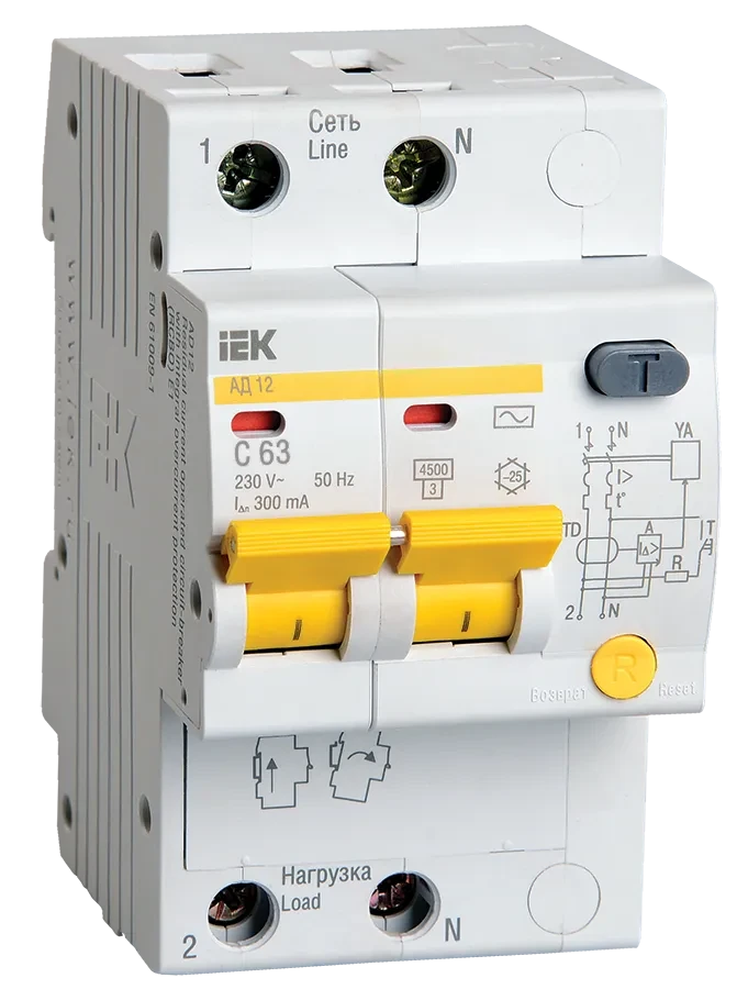 Дифференциальный автоматический выключатель АД12 2Р 63А 300мА IEK