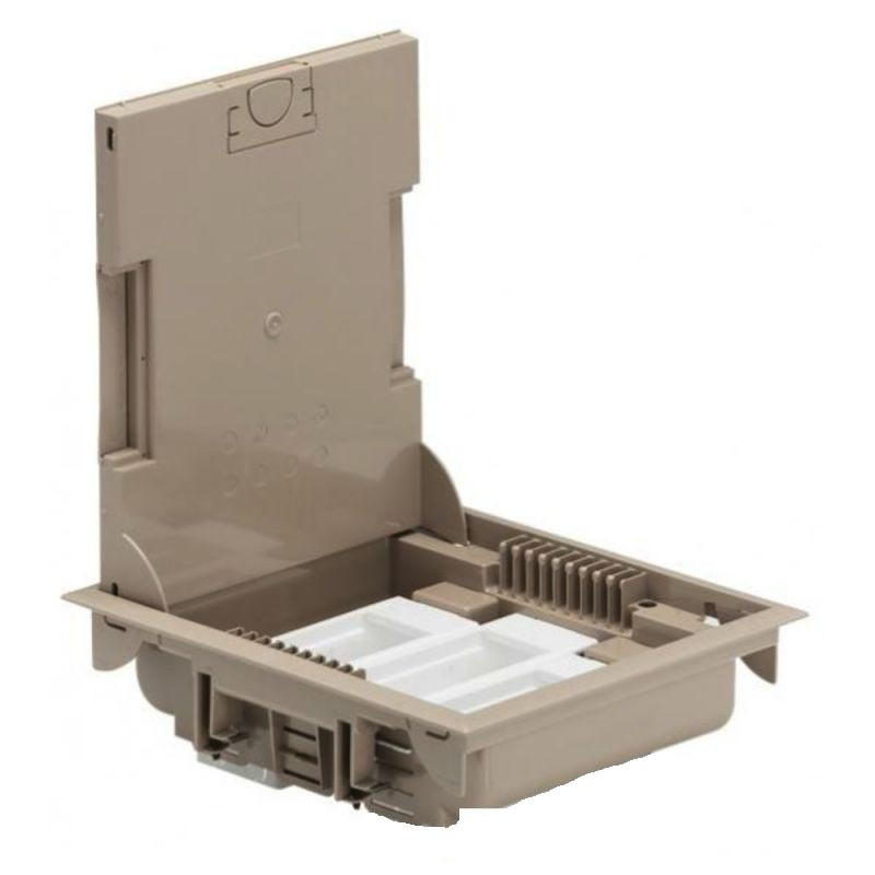 Неукомплектованная напольная коробка (напольный лючок) на 18 модулей глубиной 75-105 мм.