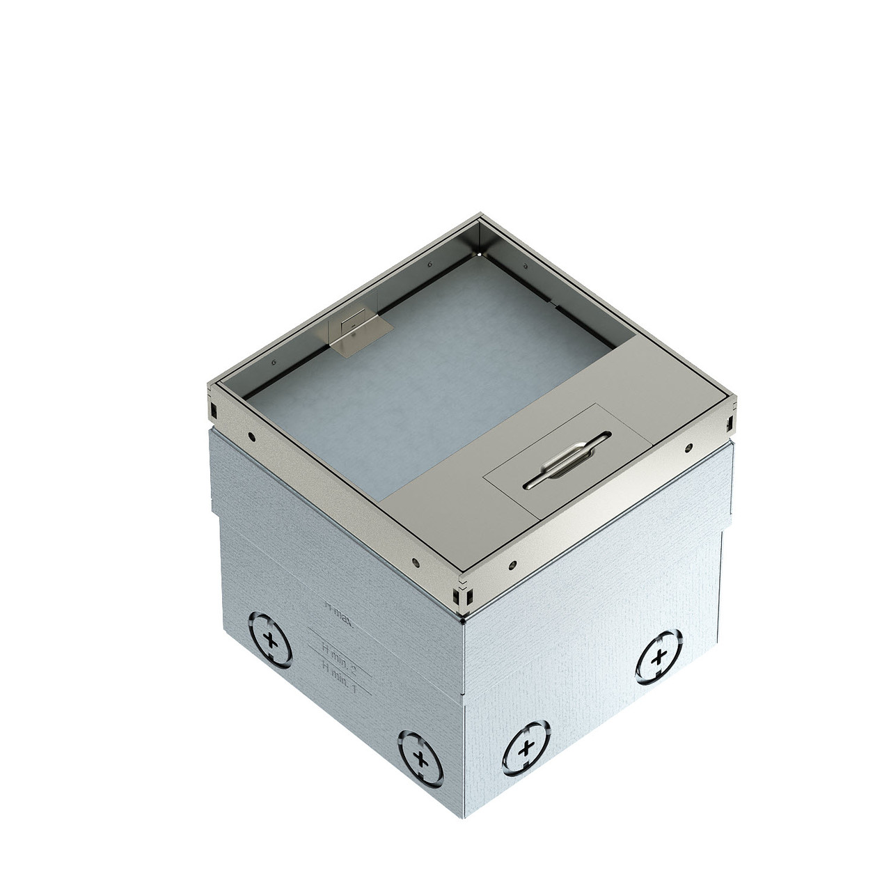 Квадратная напольная розетка для использования в полах с сухим уходом и на стяжках. Монтажный корпус с предварительно размеченными отверстиями для вставки труб (M20 / M25). Крышка регулируется по верхнему краю напольного покрытия с помощью четырех регулируемых по высоте опор. Минимальная монтажная глубина 110 мм, диапазон регулировки по высоте + 25 мм. Каркас и крышка из нержавеющей стали, видимые в напольном покрытии.