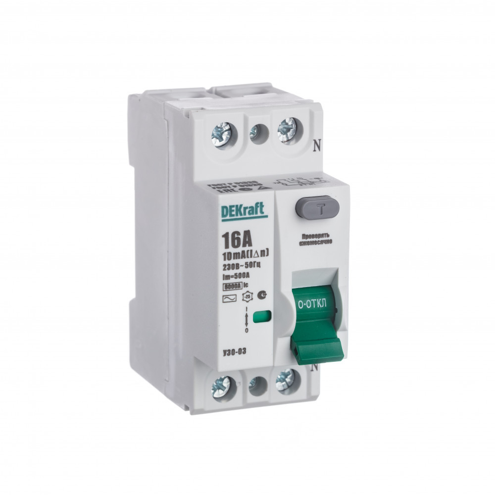 Выключатель дифференциального тока серии УЗО-03 DEKraft; 2P; номинальный ток 16; ном.дифф. ток 10 мА; электромеханический; тип дифференциального расцепителя - AC; ширина – 2 мод. х 18 мм; монтаж – на DIN-рейку. ВДТ устанавливаются в сетях напряжением до 400 В пер.тока. ВДТ применяются для защиты человека от поражения электрическим током и электроустановок от риска возникновения пожаров вследствие утечек тока. Конструкция устройств позволяет эксплуатировать их даже при низкой температуре.
