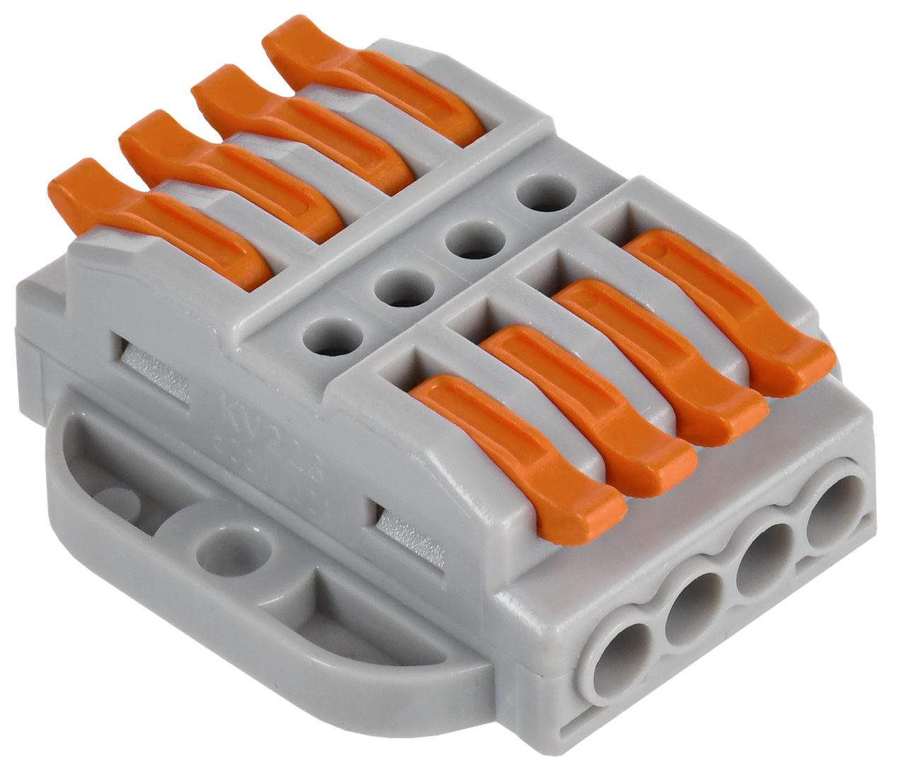 Клемма строительно-монтажная проходная с площадкой серии 222 предназначена для соединения одножильных и многожильных медных проводников без использования инструмента в электрических сетях переменного и постоянного тока. Клемма допускает многократное присоединение и отсоединение проводников. Количество подключаемых проводников - 4/4.