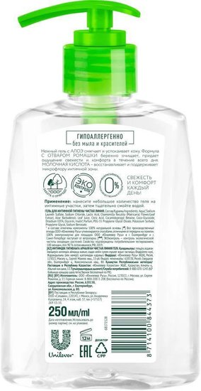 - Активные ингредиенты молочная кислота, алоэ, отвар ромашки