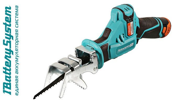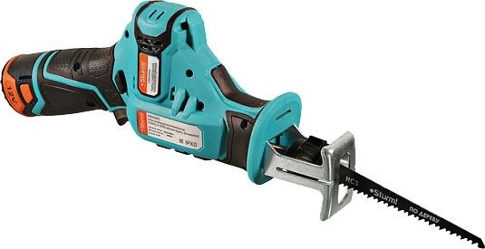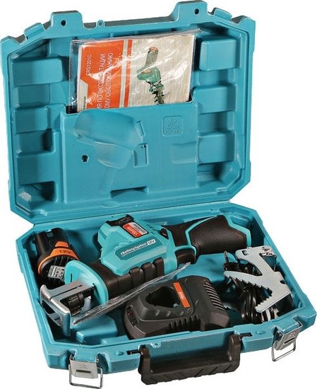 Комплектация- Пила сабельная аккумуляторная (1 шт)- Пильное полотно по дереву (1 шт)- Аккумуляторная батарея 2.0 Ач (1 шт)- Зарядное устройство (1 шт)- А-образный упор (адаптер для веток) (1 шт)- Пластиковый кейс (1 шт)- Инструкция по эксплуатации (1 шт)- Инструкция по безопасности (1 шт)