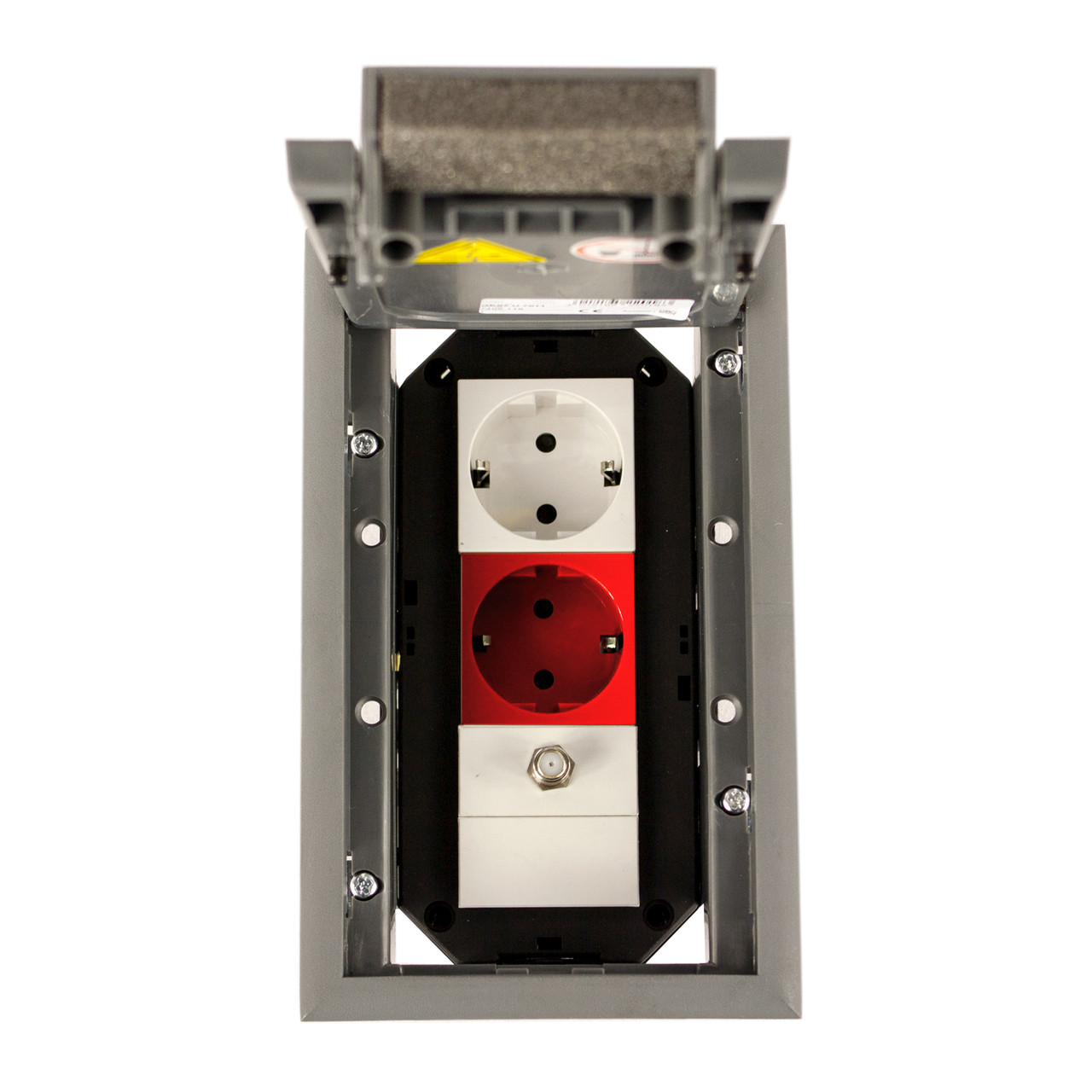 Лючок рассчитан на установку в каналы, прокладываемые под полом, и бетонную стяжку при использовании монтажного основания (артикул: 7410030) и крышки (артикул: 7400455). Встраиваемые устройства монтируются в специальную коробку (артикул: 7407224).