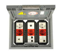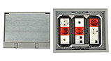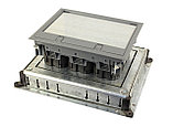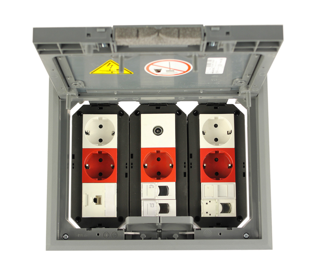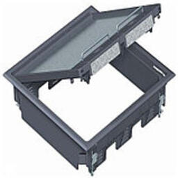 Лючок для 9 электроустановочных изделий в 3-х монтажных коробках GB2, для установки в системах кабельных каналов и в двойном полу. Универсальный крепежный угол регулируется для толщины двойного пола до 65 мм.