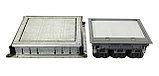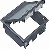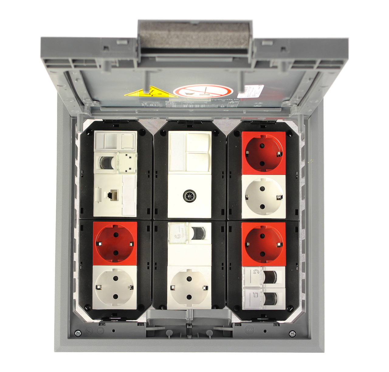 Лючок для 12 электроустановочных изделий серии Modul 45 в 3-х монтажных коробках GB3 для установки в системах кабельных каналов и в двойных полах. В комплекте с универсальным крепежным уголком с диапазоном регулирования до 65 мм. С защитной рамкой для напольного покрытия, откидной крышкой и кабельным выводом из полиамида. Выемка в откидной крышке для фрагмента напольного покрытия толщиной 5 мм (при необходимости возможно регулирование до 3, 8 или 10 мм).