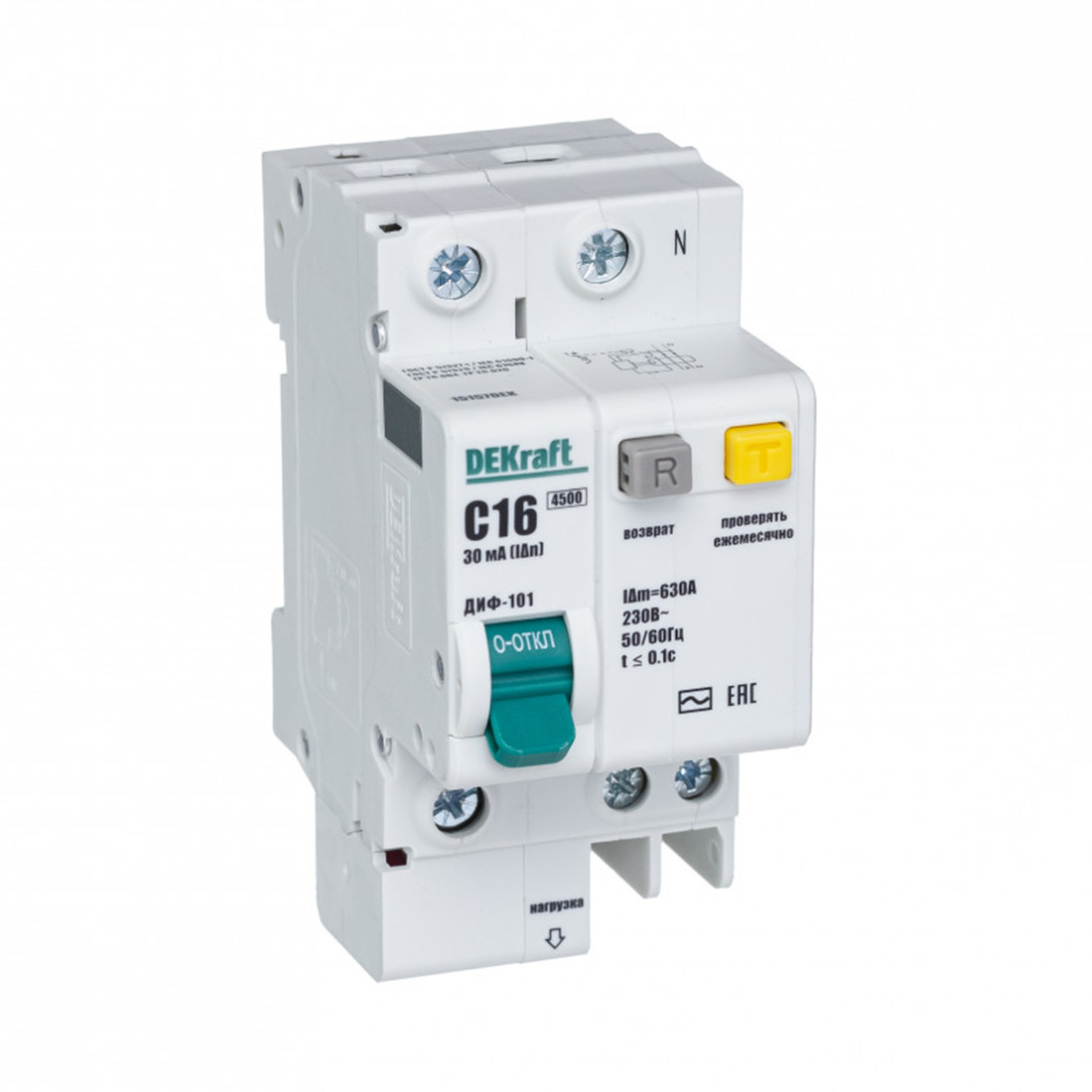 Автоматический выключатель дифференциального тока серии ДИФ-101 DEKraft; 1P+N; ном.ток 16 А; характеристика C; откл.способность Icn = 4,5 kA; ток утечки 30 мА; блок дифф.защиты – электронный; ширина – 2,5 мод. х 18 мм; монтаж – на DIN-рейку. АВДТ применяются в сетях напряжением до 220 В пер.тока для защиты электроустановок от сверхтоков и токов утечки. Для расширения функционала АВДТ возможно использование аксессуаров от выключателей серии ВА-101.