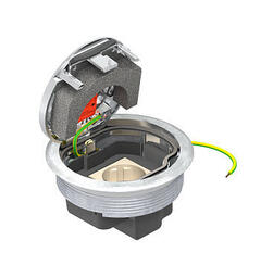 Лючок GESRM2 с защитной рамкой, для монтажных оснований UZD/UDL, хромированный Круглый лючок с защитной рамкой для напольного покрытия. Предусмотрен для установки в монтажных основаниях UDL2-120 70 (стяжка 70 мм) или UDL2-120 80 (стяжка 80 мм), а также в усиленном монтажном основании UDL1-120 70 90SL. Допускается установка в монтажных основаниях UZD / UGD 250-3 или 350-3, с применением крышек DUG 250-3 RM2 или DUG 350-3 RM2, соответственно. Лючок с одинарной розеткой 33° с защитным контактом. С боковой стороны рядом с розеткой можно дополнительно установить максимум 2 телекоммуникационных модуля. При закрытом лючке допускается влажный тип уборки. Минимальная монтажная глубина составляет 70 мм. Поверхность хромированная.