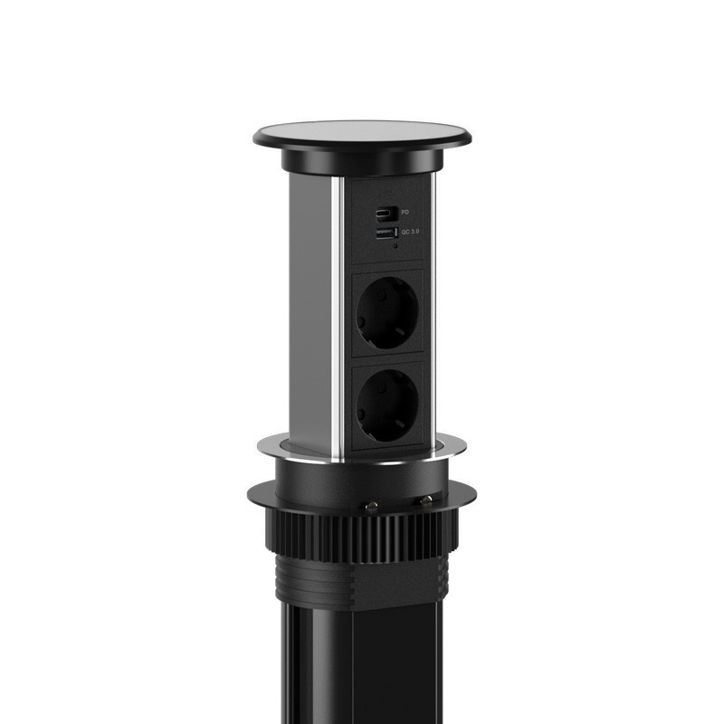 Shelbi STVA-4-WC-IP54-S – выдвижной автоматический настольный розеточный блок с высокой степенью защиты IP54 , обеспечивающий надежную защиту от пыли и влаги. Отличное решение для офисов, кухонь, рабочих зон и других помещений, требующих удобного доступа к электропитанию и зарядке мобильных устройств.