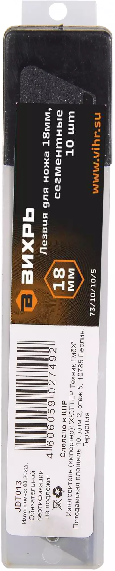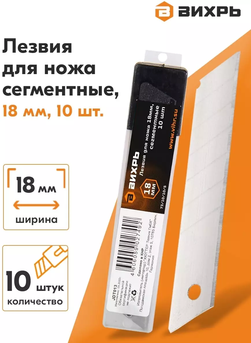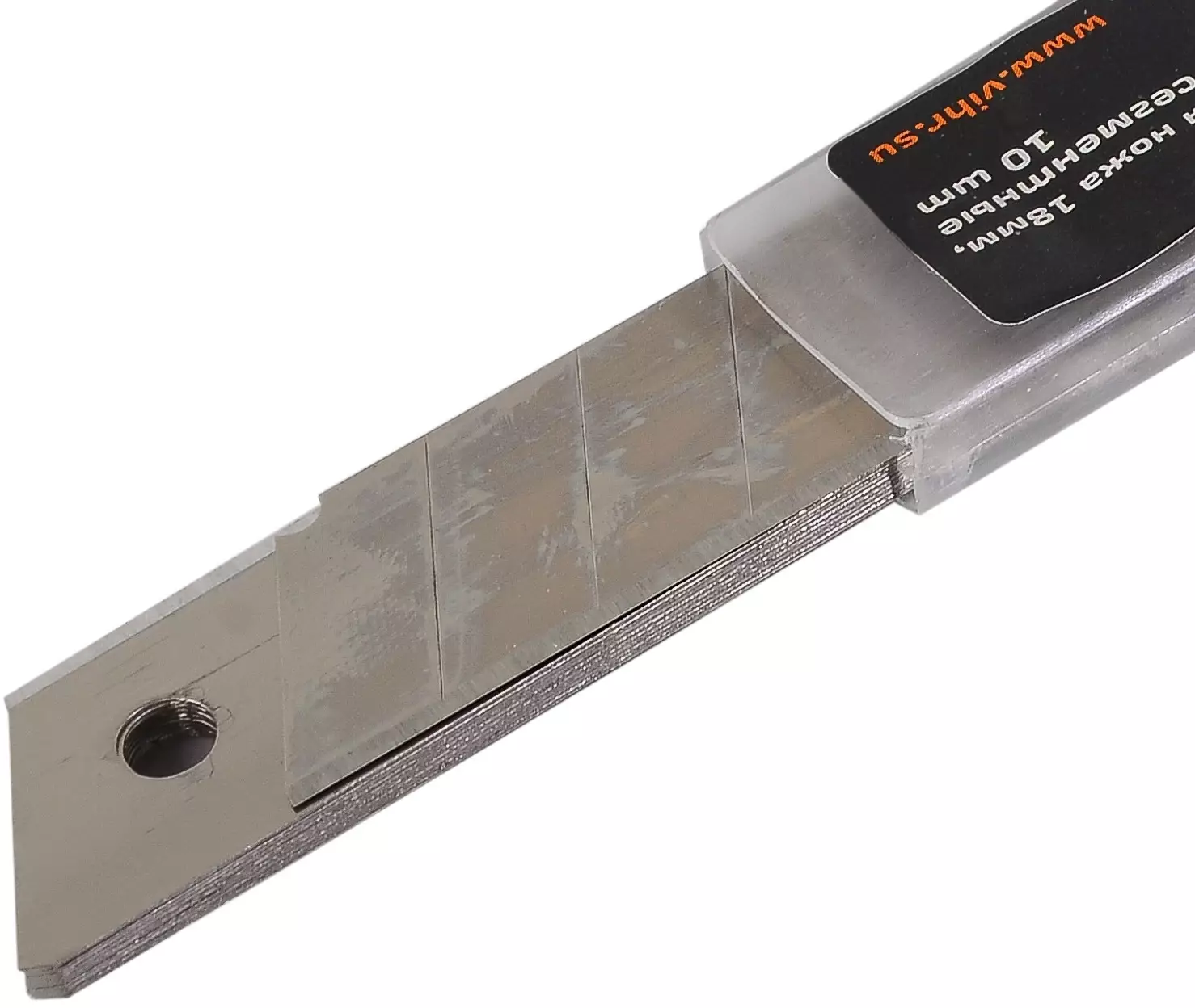 ОсобенностиЛезвия для ножа 18 мм., 10 шт., Вихрь. Лезвия поставляются по 10 штук в пластиковом боксе. Лезвия подходят как к ножам Вихрь, так и к ножам других брендов с шириной лезвия 18 мм.